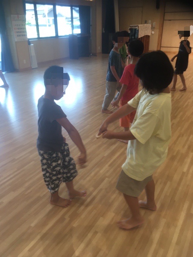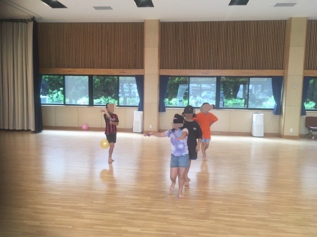 目隠し鬼ごっこをみんなで行っています、耳を澄まして周りの子どもの氣配を感じ取る練習にもなります。