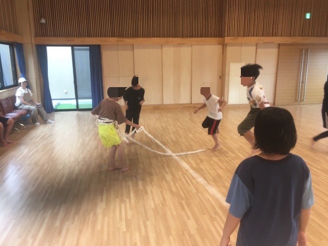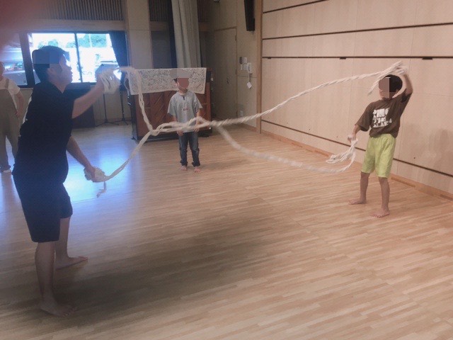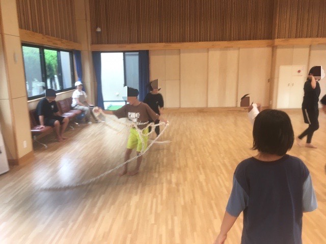 ロープを二本使用した縄跳びを行っております、二人で息を合わせて縄を回さないと二本の縄が絡まってしまいます、相手の動きを読む練習にもなります。