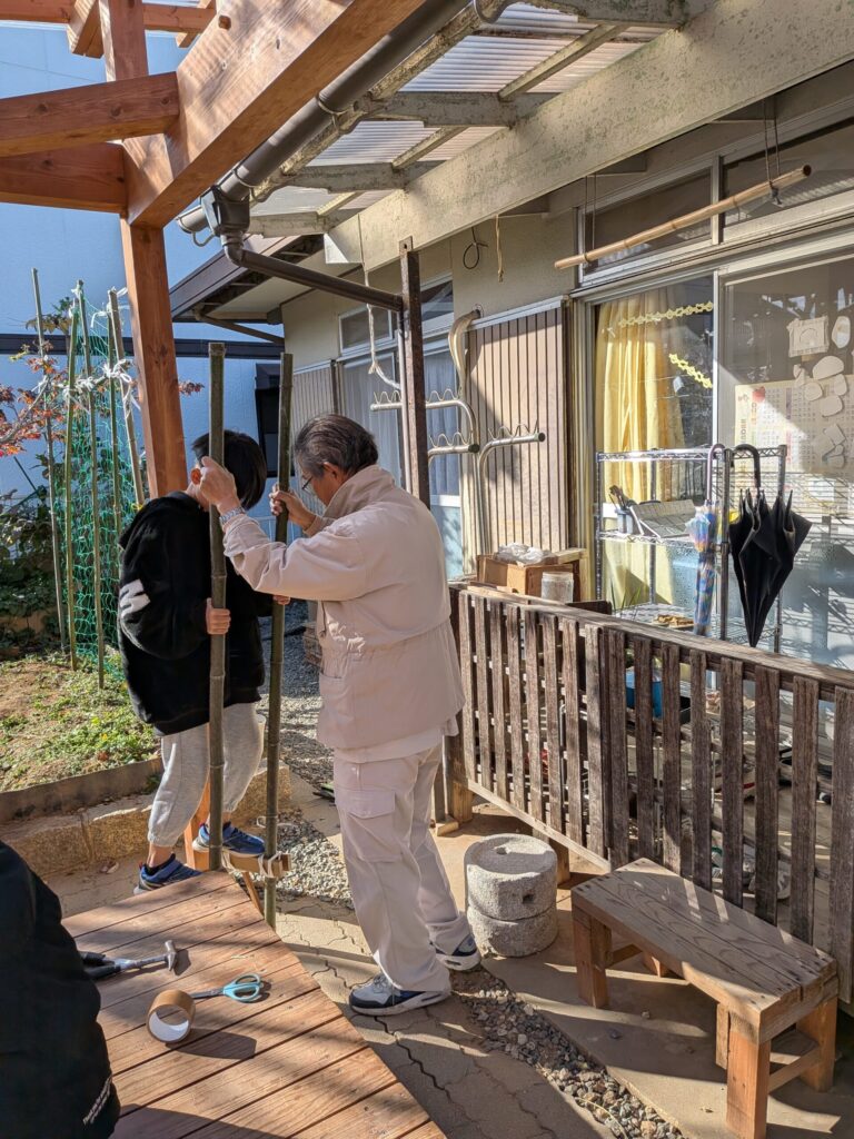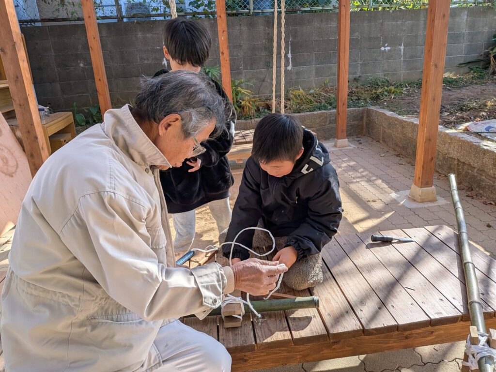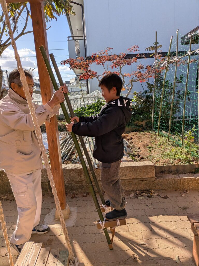 11月に竹馬作りをしました!まだスタッフの補助がないと難しいですが