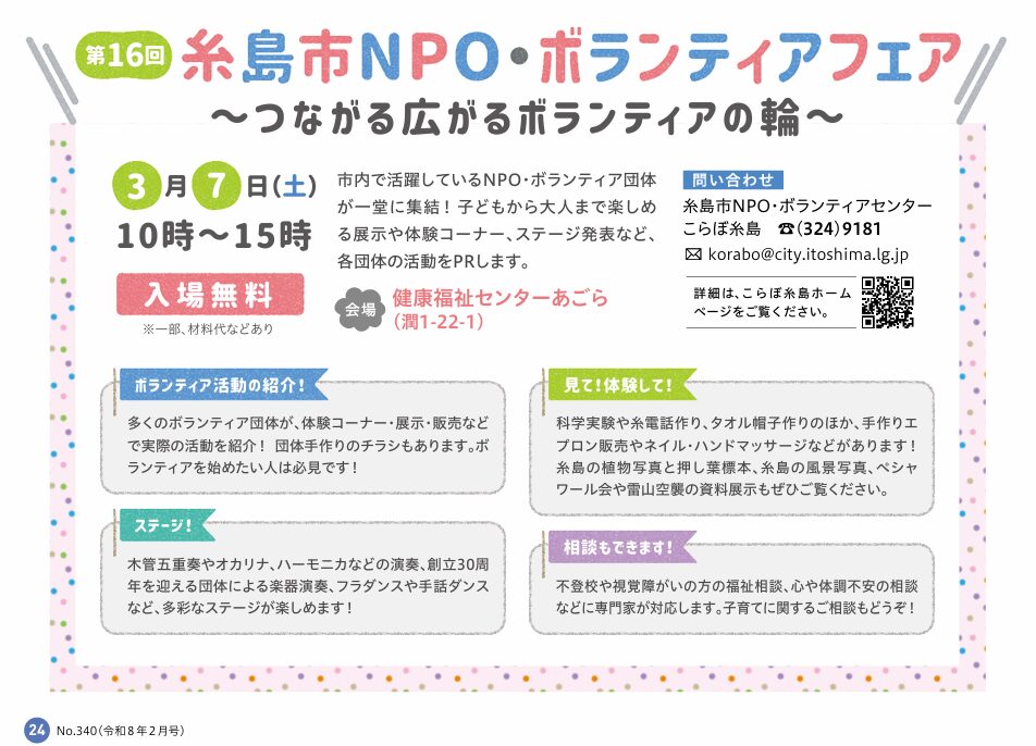 糸島市NPO・ボランティアフェアについてはこちら(広報いとしま2月号より)⇩