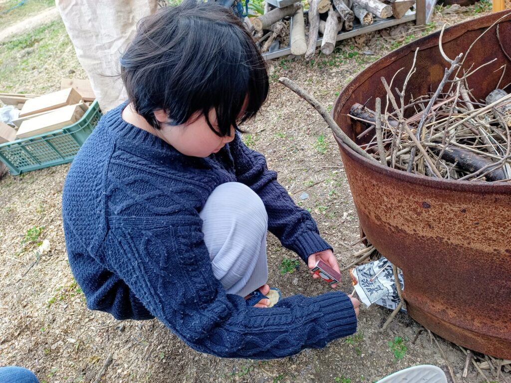 寒いね、とまずは火おこし マッチでシュッシュッと 火をつけるのも上手になってきてます