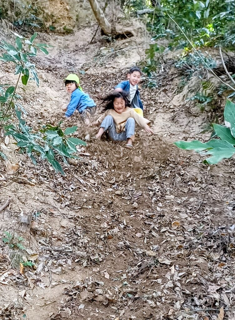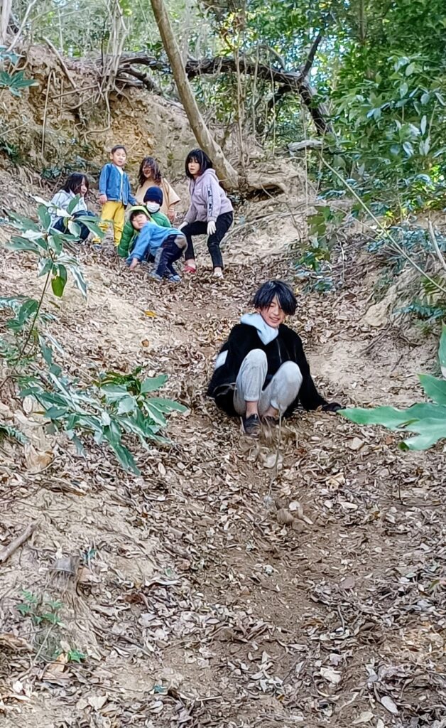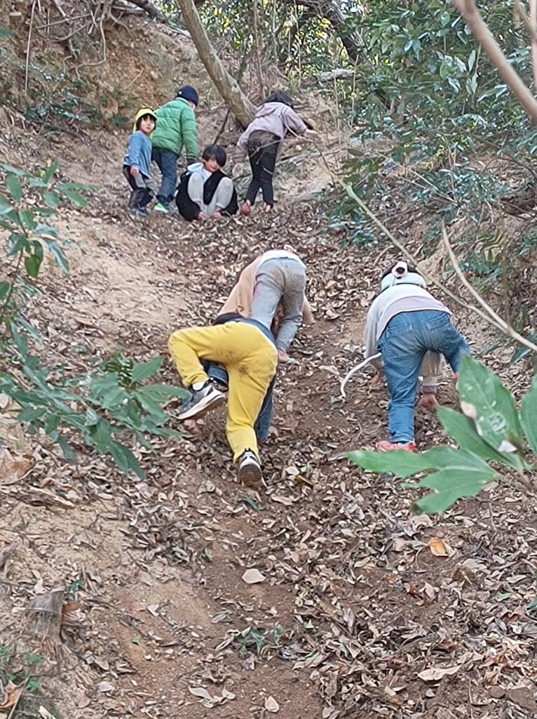 今回はまほろば保育園のこども達も一緒でした ずるずるすべりながらの裏山登り