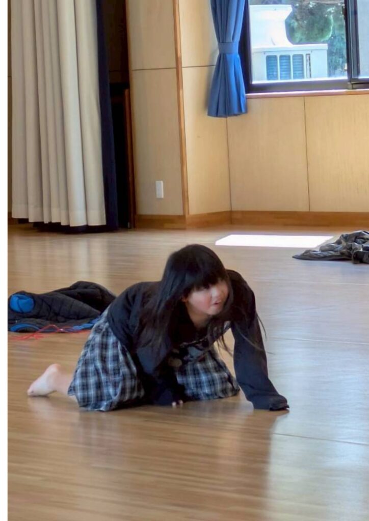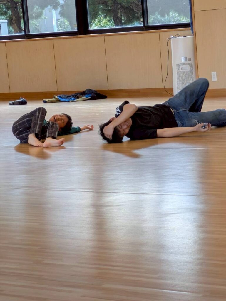 床に寝そべって身体を横回転しながら追いかけっこを行いました(子ども達は鉄火巻きの動きと言っていたかな)横回転を行う事により頭から足先までの身体の軸が見つけやすくなります。